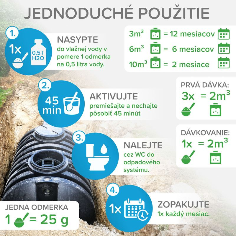 - Jednoduchá aplikácia priamo do septiku alebo žumpy