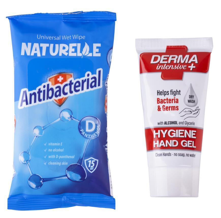 Obsah setu: balík KEEP SAFE (3x chirurgické rúško, 6x nitrilové rukavice, 50 ml dezinfekcia na ruky, 15x antibakteriálne vlhčené utierky), čiapka, rukavice, ponožky