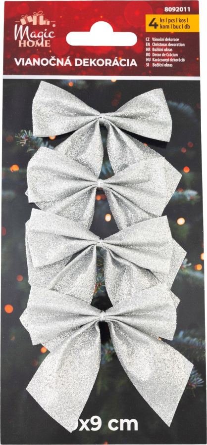 Dekorácia MagicHome Vianoce, mašla, strieborná, bal. 4 ks, 9 x 9 cm