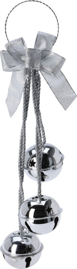 Elegantná vianočná dekorácia Zvončeky na dvere v striebornej farbe dodá vášmu domovu sviatočný pôvab a decentný lesk. Tri kovové zvončeky zavesené na ozdobnej šnúrke a doplnené mašľou vytvárajú harmonický a vkusný doplnok, ktorý privíta vašich hostí jemným cinkaním.