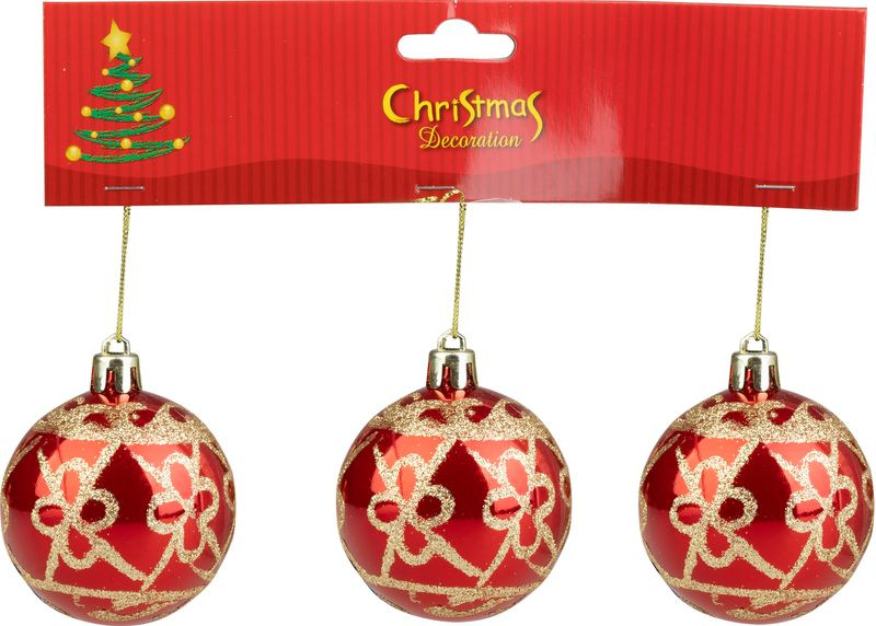 Súprava ozdôb na stromček slúži na slávnostné ozdobenie vianočného stromčeka. Pozostáva z 3 ks vianočných gulí so zlatým ornamentom s priemerom 6 cm. Farba je červená.