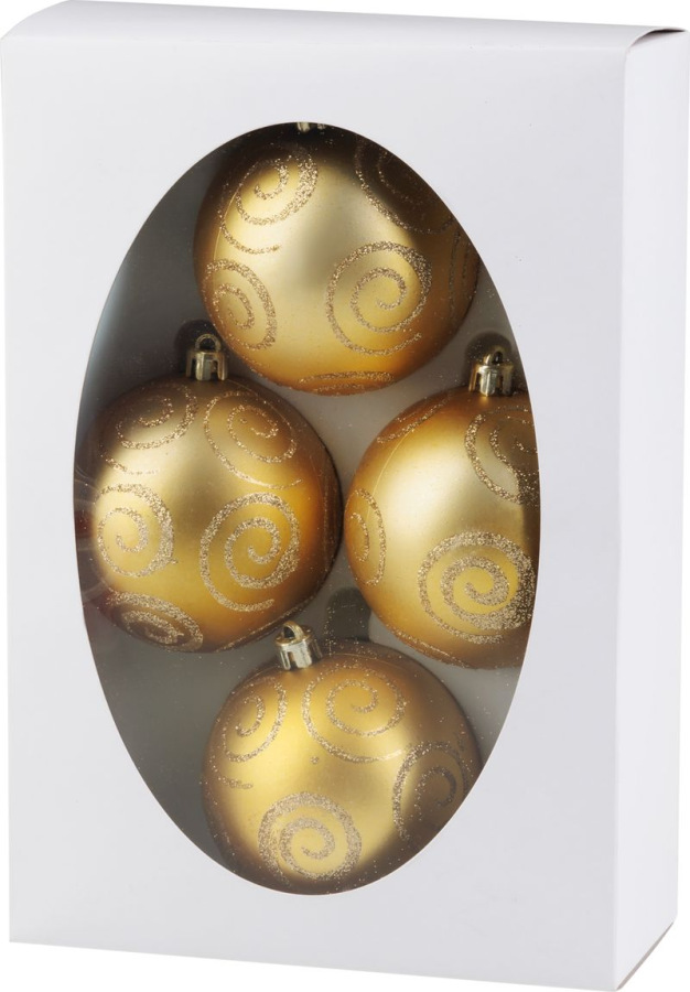 Súprava ozdôb na stromček slúži na slávnostné ozdobenie vianočného stromčeka. Pozostáva zo 4 ks gulí s ornamentmi s priemerom 7 cm. Farba gulí je zlatá.