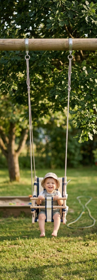 Plátená detská hojdačka modrej farby je prispôsobená pre tých najmenších. Vďaka svojmu polo-ležatému tvaru do nej jednoducho dieťa uložíte. V prednej časti hojdačky sa nachádza drevená zábrana voči vypadnutiu. Drevené časti sa pre spevnenie celej hojdačky nachádzajú aj po bokoch sedacej časti. Na bokoch hojdačky sú umiestnené laná s priemerom 10 mm a dĺžkou 2 m. Potrebnú dĺžku lán si viete manuálne nastaviť a zauzliť. Na predom našrubované háky vložíte kovové oká na koncoch lán. Po tomto kroku je už možné bezpečne sa hojdať. Nosnosť je 25 kg a rozmery sú 36 x 24 x 45 cm.