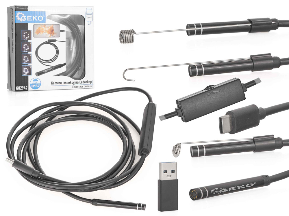 Endoskop funguje so smartfónmi a tabletmi s verziou Androidu nad 6.0, ktoré podporujú štandard OTG. Sada obsahuje sadu príslušenstva (háčik, magnet, zrkadlo)