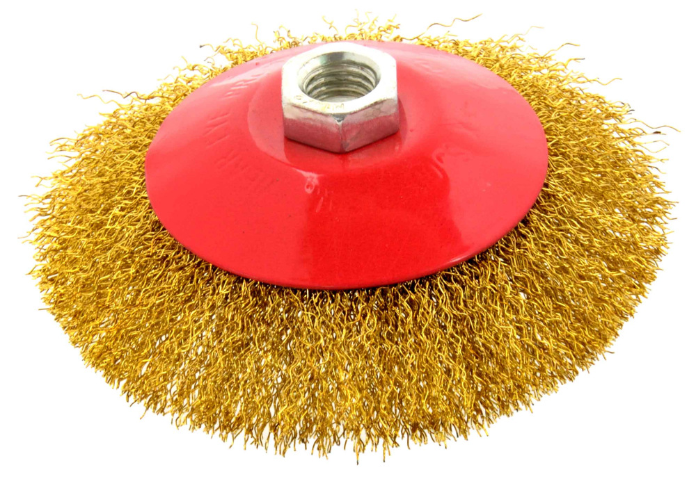 Miskový kartáč oceľ-mosadz 125 mm / 3 "M14. Ideálny na renovačné práce, čistenie kovových povrchov, odstraňovanie starých farieb, lakov, hrdze, otrepov atď.