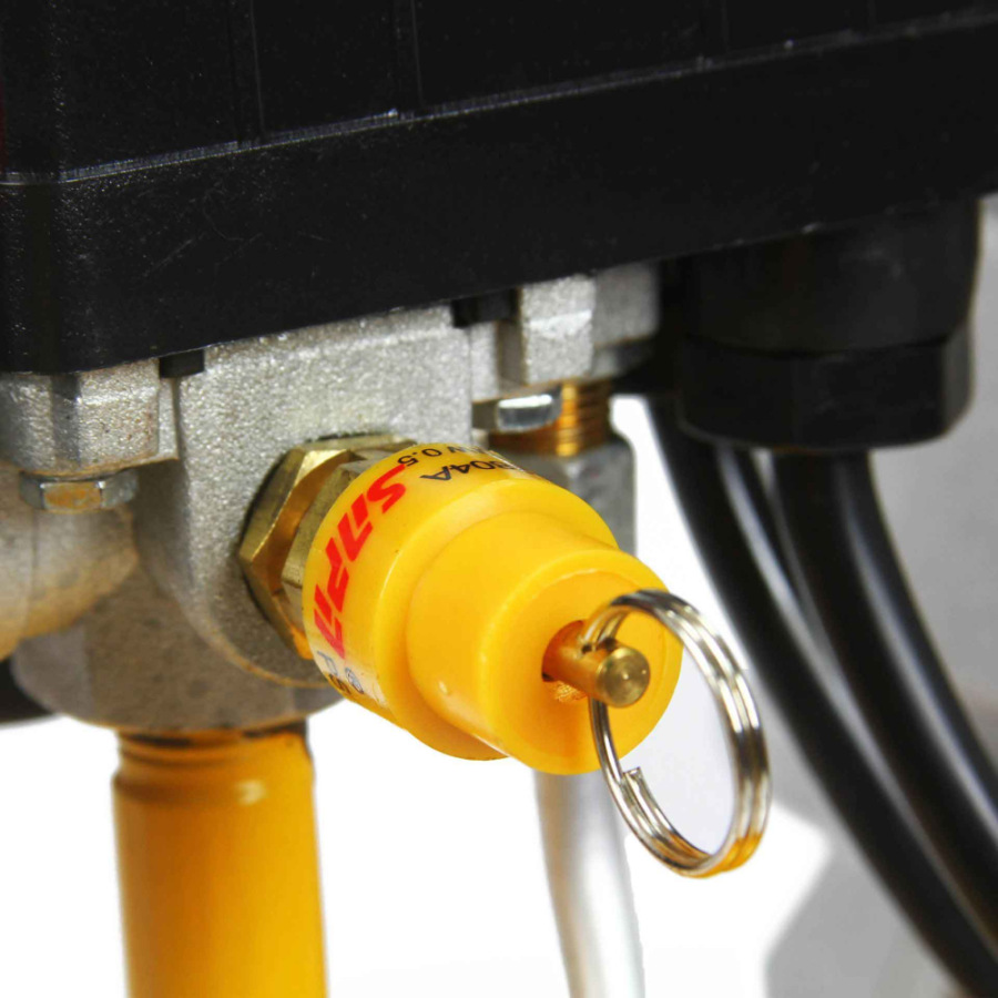 - Spätný ventil - s automatickou dekompresiou. Dekompresný ventil namontovaný medzi hlavami kompresora navyše uľahčuje spustenie zariadenia. V spodnej časti valca je namontovaný vypúšťací ventil, ktorý umožňuje odvádzanie kondenzátu. Nenahraditeľné, účinné a predovšetkým spoľahlivé zariadenie doma, v garáži alebo v dielni.