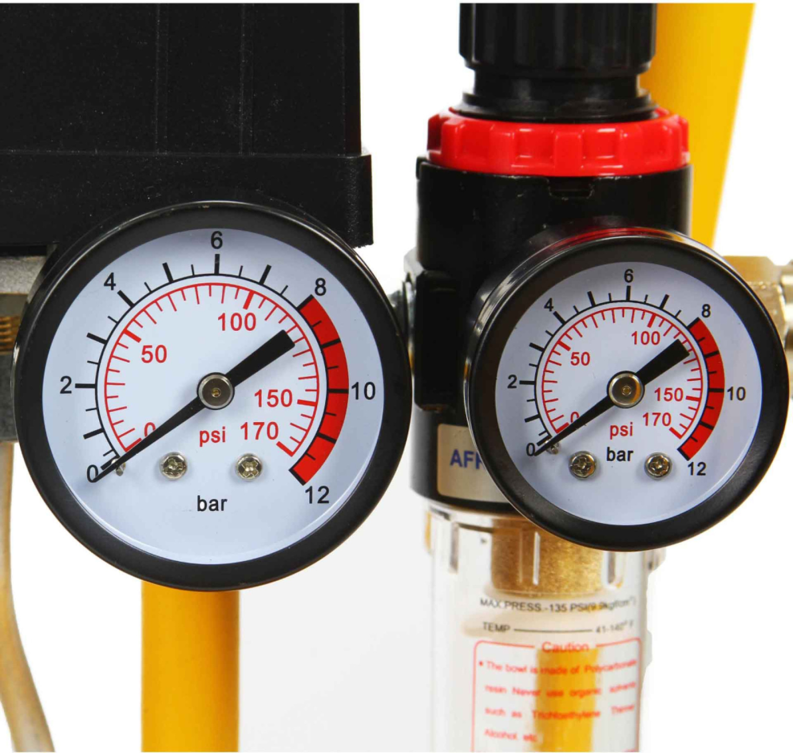 Kompresor sa vyznačuje nízkou spotrebou energie pri zachovaní vysokých prevádzkových parametrov, ktoré je možné monitorované pomocou presných tlakomerov. Väčší manometer vľavo ukazuje aktuálny tlak vo valci. Menší manometer vpravo ukazuje výstupný tlak po nastavení.