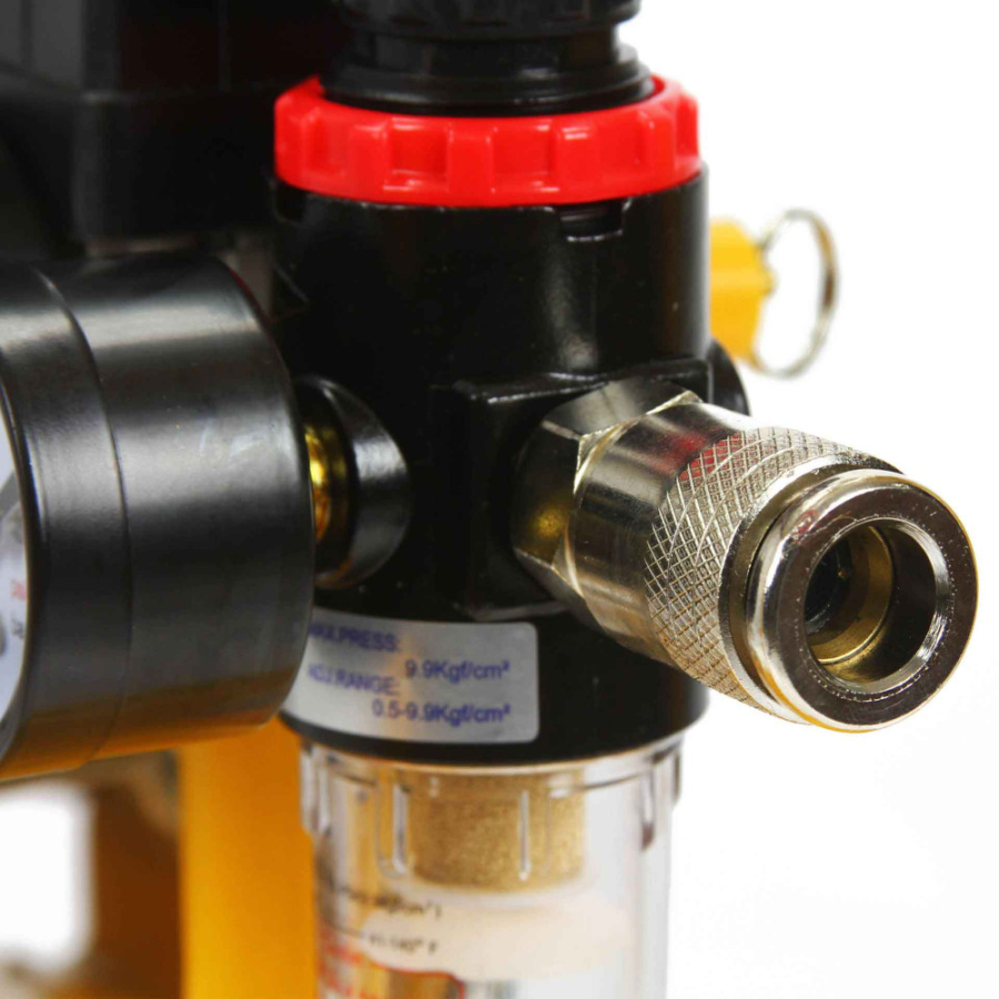 Kompresor je vybavený odlučovačom vody, regulátorom, redukčným ventilom tlaku, 2 presnými tlakomermi, poistným ventilom a vzduchovým filtrom pre predĺženie životnosti.