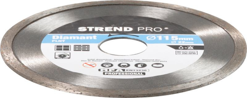 Plný diamantový kotúč Strend Pro je vhodný pre domácich kutilov, ale aj pre profesionálnych remeselníkov. Vhodný je na mokré aj suché opracovávanie. Jeho použitie je rozsiahle - kameň, keramika, strešná krytina, tvárnice, betón, tehly, stavebné materiály, mramor a kameninové rúry. Jeho priemer je 115 mm a maximálne povolené otáčky sú 13200 rpm.