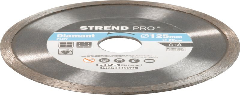 Diamantový plný kotúč Strend Pro je určený pre domácich kutilov, ale aj pre profesionálnych remeselníkov. Vhodný je na mokré a suché opracovávanie.Jeho použitie je rozsiahle - tehly, murivo, kameň, dlažba, obklad, keramika, strešná krytina, žula, mramor, kameninové rúry. Jeho priemr je 125 mm a maximálne povolené otáčky sú 12200 rpm.