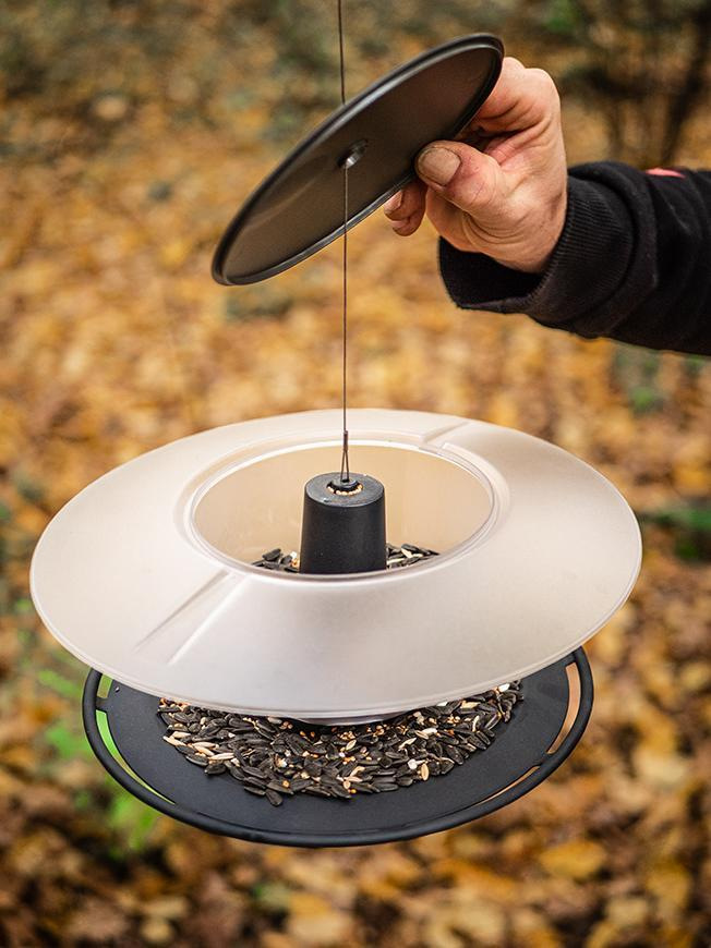 - Krmítko možno pripevniť na kôl alebo pripevniť k vetve stromu pomocou plastovej pásky.