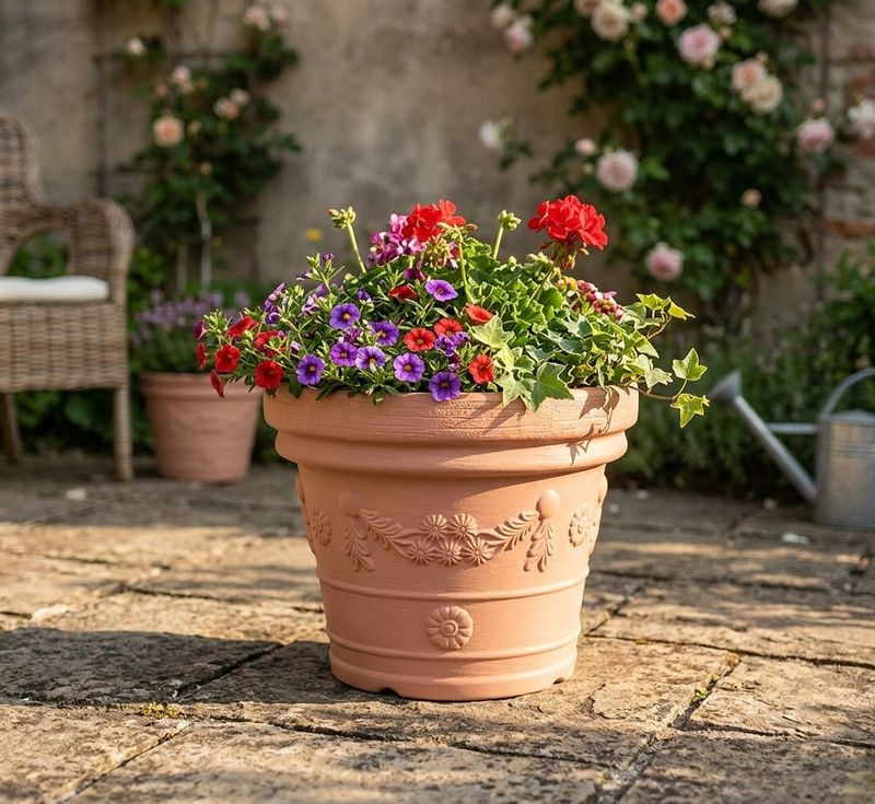Klasický kvetináč Decora s dekorom kvetov v terakota farbe skrášli Váš dom. Rozmery: 57x45,5 cm.