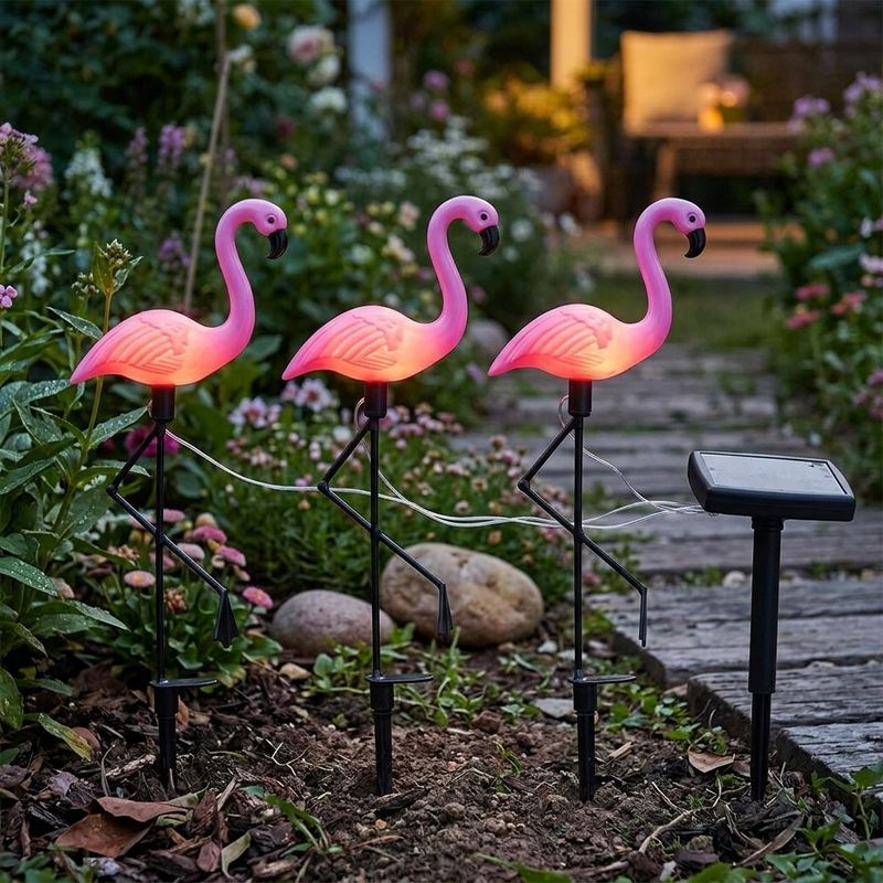 Dizajnové solárne lampy Plameniaky sú moderným doplnkom každej záhrady, dokonale obzvláštnia každý dvor. Lampa je vyrobená z plastu a kovu. Počas dňa solárny panel konvertuje slnečnú energiu na elektrickú energiu, ktorá sa ukladá do dobíjateľnej batérie. V noci sa svetlo automatický zapne a využíva uloženú energiu. Lampa tak prostredníctvom LED diódy svieti príjemným svetlom. Rozmery tejto lampy sú 18x6x52,5 cm. Balenie obsahuje 3 ks.