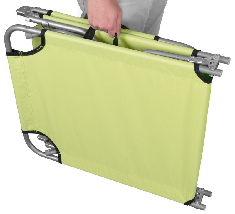 Zelené lehátko je určené pre umiestnenie vo vonkajších priestoroch. Konštrukcia lehátka je kvôli pevnosti vyrobená z kovu, s priemerom 22 x 1 mm. Zvyšná časť, určená pre ležanie, je pokrytá odolným textilenom. Celkovo poskytuje lehátko nosnosť 120 kg. Lehátko je polohovateľné, pomocou troch západok na zadnej strane konštrukcie. Je možné nastaviť polohu pre sedenie, sedenie v miernom záklone alebo pre ležanie. Rozmery lehátka sú 188 x 55 x 27 cm.