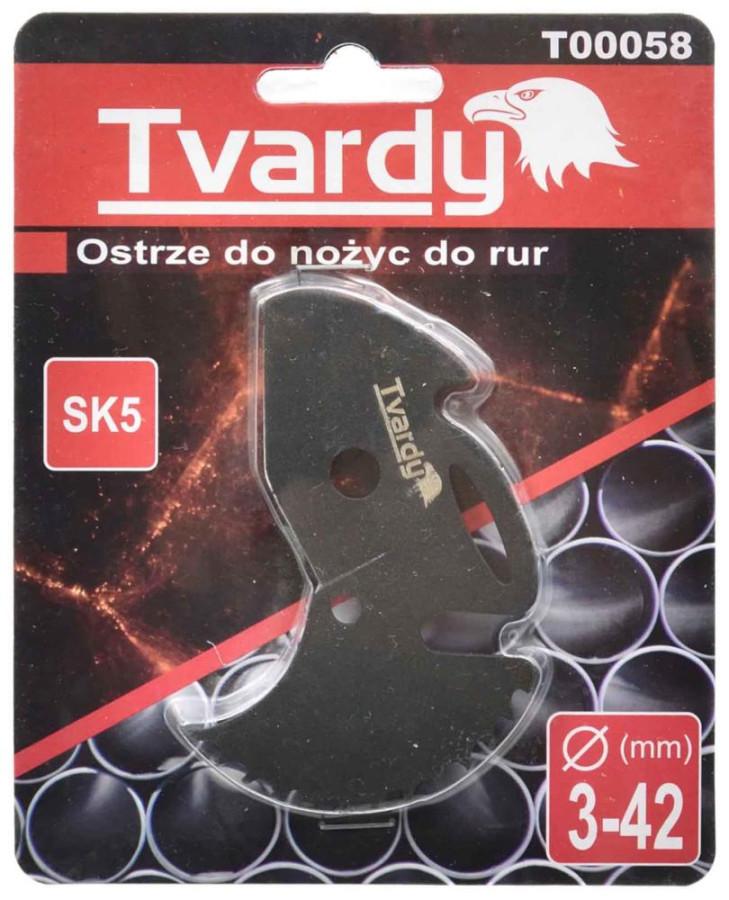 Vymeniteľná čepeľ pre rezačky rúr Tvardy s pracovným rozsahom od 0 do 42 mm. Je vyrobený z vysoko uhlíkovej nástrojovej ocele SK5 vyznačujúcej sa veľmi vysokou odolnosťou proti štiepaniu a praskaniu, navyše je to oceľ s vysokou odolnosťou proti oderu, vďaka čomu sa oveľa pomalšie otupuje.