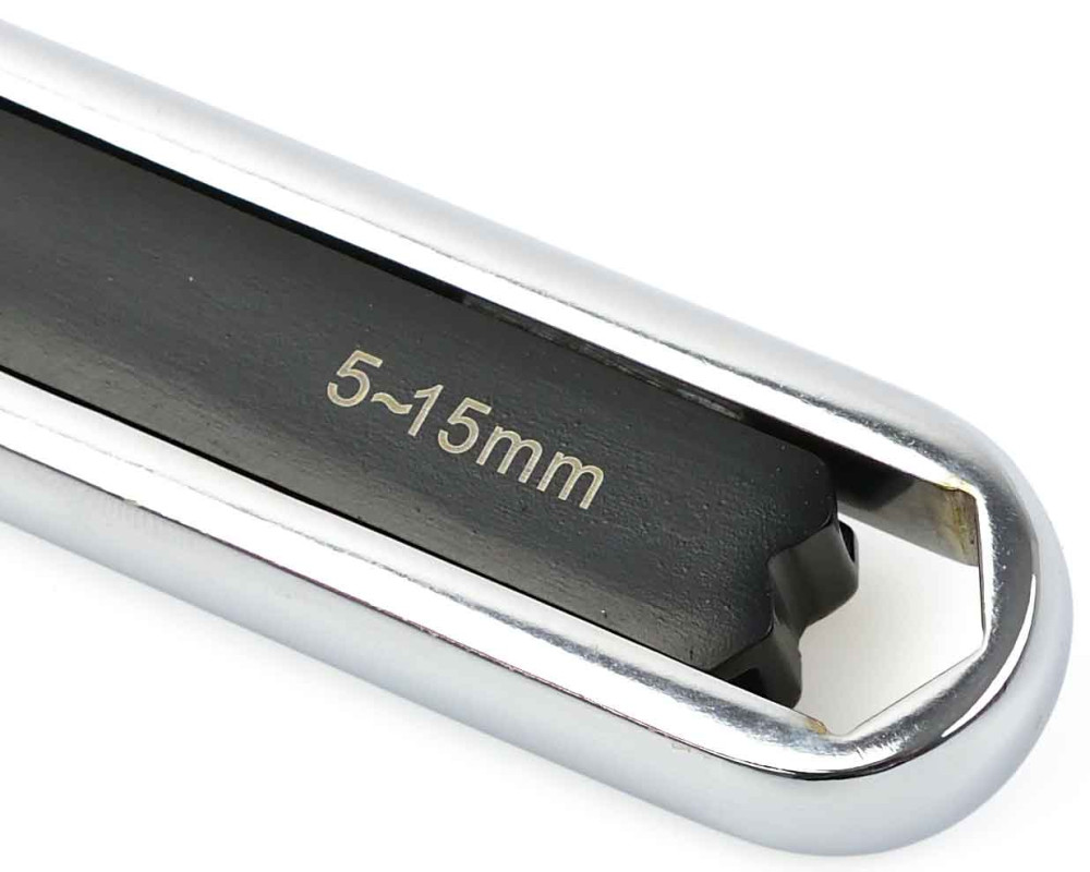 Obojstranný nastaviteľný očkový kľúč vyrobený z odolnej CrV nástrojovej ocele. Skrutka poskytuje plynulé nastavenie v rozsahu 5-15 mm a 15-27 mm. Štyri body kontaktu so skrutkou umožňujú prenos vysokej sily. Vhodné pre metrické aj palcové skrutky.