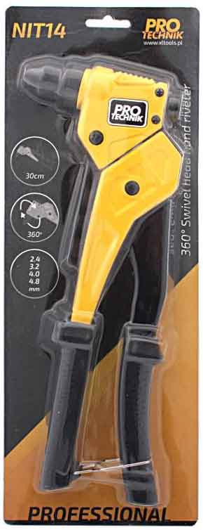 Ručné nitovacie kliešte sú nástroj určený na spájanie prvkov pomocou nitov. Disponuje 360° otočnou hlavou, ktorá umožňuje prácu na ťažko dostupných miestach. Je vybavená štyrmi hrotmi, ktoré umožňujú prácu s nitmi s priemermi 2,4, 3,2, 4,0, 4,8 mm. Rukoväť náradia je pogumovaná a profilovaná, čo zaisťuje pevné uchopenie a komfort používania. Okrem toho má nitovač zabudované vrecko na kľúče, ktoré uľahčuje rýchlu výmenu hrotov. Pevný kovový kryt nástroja zaisťuje jeho odolnosť a spoľahlivosť počas prevádzky.