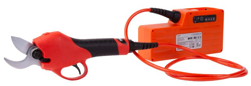 Pre správne fungovanie je potrebné vložiť do zariadenia lítiový akumulátor, ktorého napätie je 36 V a kapacita až 4 Ah. Akumulátor sa nabíja 5-6 hodín nabíjačkou v zdroji napätia 230 V, a poskytuje 6-8 prevádzky (nie nepretržitej). Môžete ho pri práci nosiť v batohu, ktorý je súčasťou balenia, takže Vás jeho váha nijako neobmedzuje v činnosti. Výhodou je, že zariadenie je chránené proti prehriatiu automatickým vypnutím. Pre Vašu ochranu pri práci sú tieto nožnice vybavené aj bezpečnostnou poistkou.