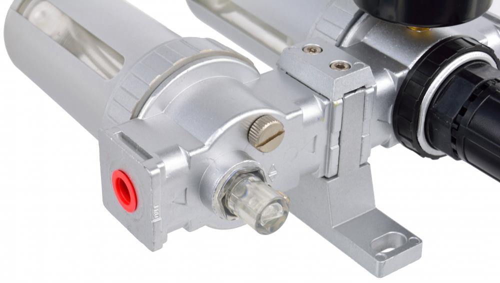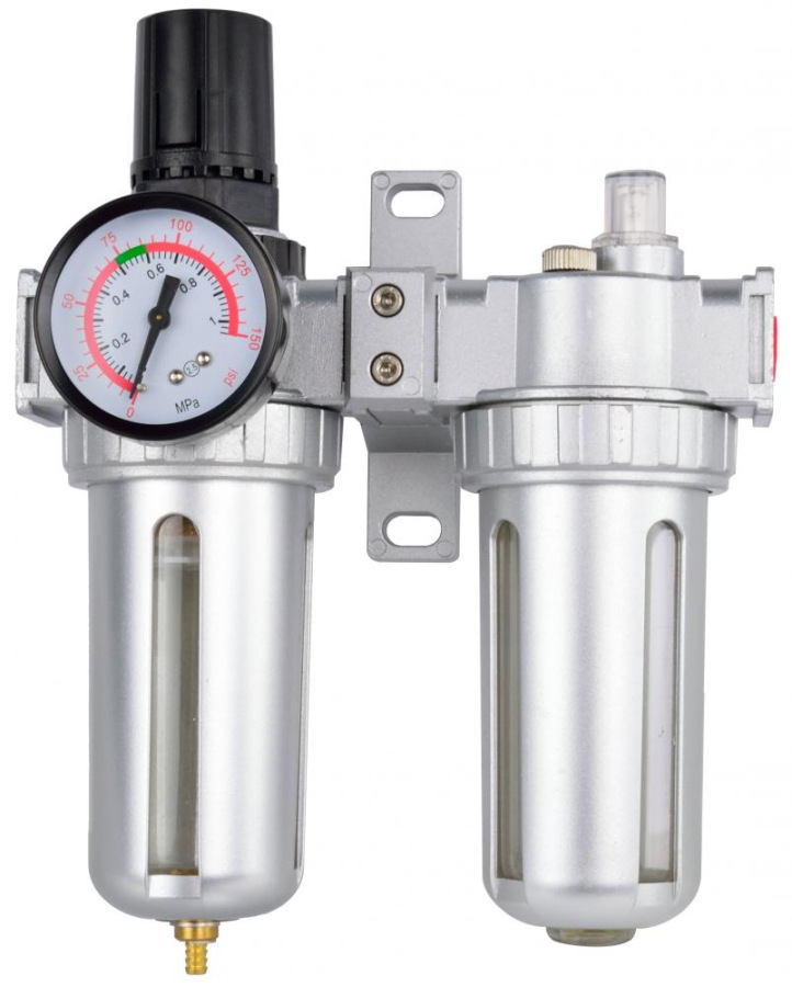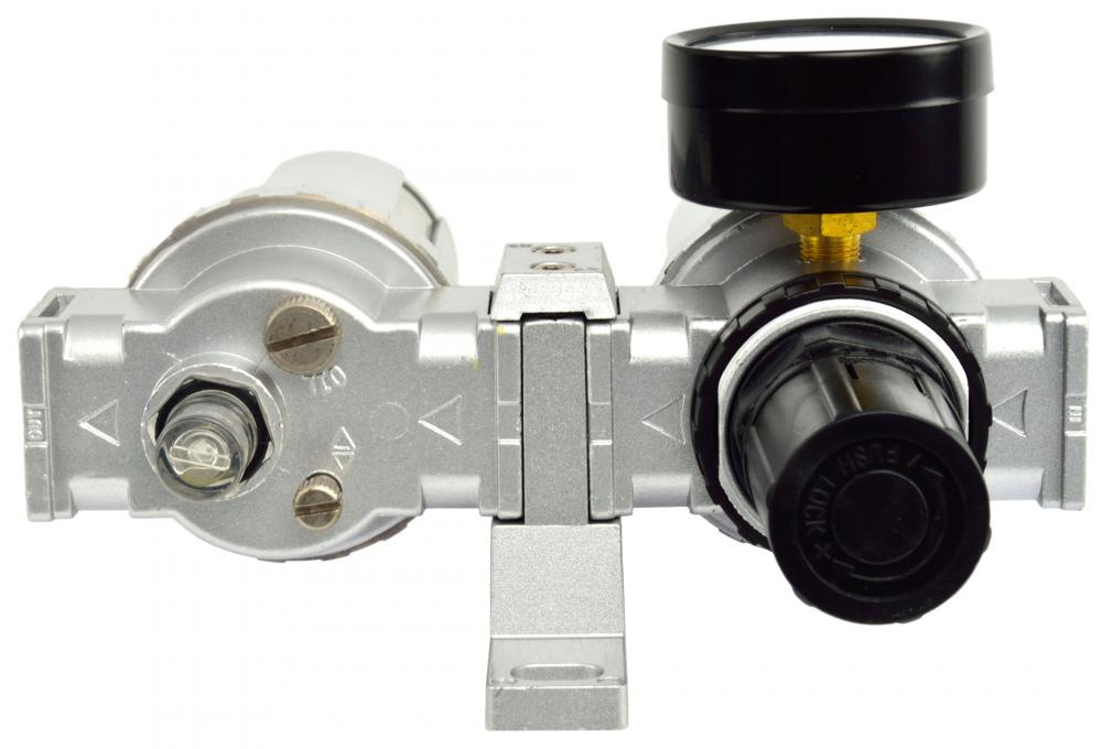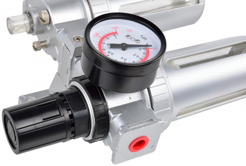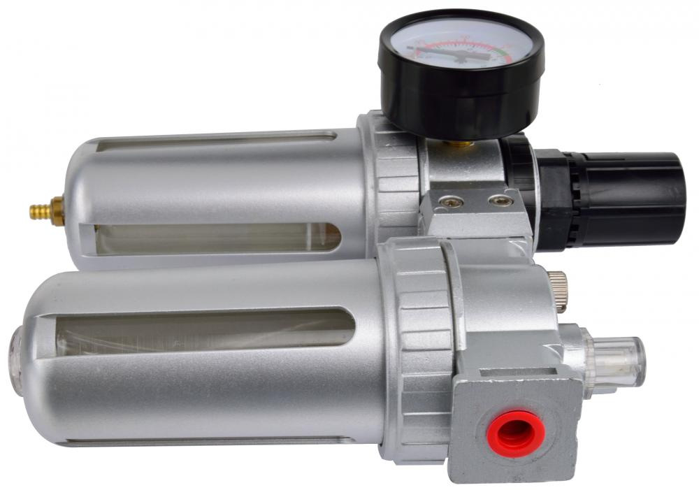 Regulátor tlaku s filtrom a s hmlovým primazávačom oleja je určený na úpravu stlačeného vzduchu na pohon pneumatického náradia. Zariadenie umožňuje regulovať tlak vzduchu, odstrániť skondenzovanú vlhkosť zo vzduchu a pridávať pneumatický olej do prúdu stlačeného vzduchu vo forme hmly.