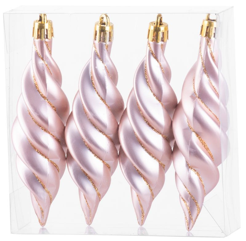 Súprava ozdôb na stromček slúži na slávnostné ozdobenie vianočného stromčeka. Pozostáva zo 4 ks vianočných ozdôb s rozmerom 11x3 cm. Farba ozdôb je ružová. Sú vyrobené z plastu.