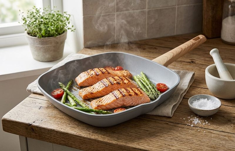 Panvica je vybavená keramickým povrchom, ktorý zaručuje vynikajúce nepriľnavé vlastnosti bez obsahu škodlivých látok – neobsahuje PFOA, PFOS, VOC, olovo ani kadmium. Grilovacie drážky na dne panvice vytvárajú charakteristické línie na mäse, zelenine či rybách, pričom odvádzajú prebytočný tuk preč od potravín. Vonkajší povrch je chránený teplovzdorným náterom, ktorý zaisťuje dlhú životnosť aj pri intenzívnom používaní.
