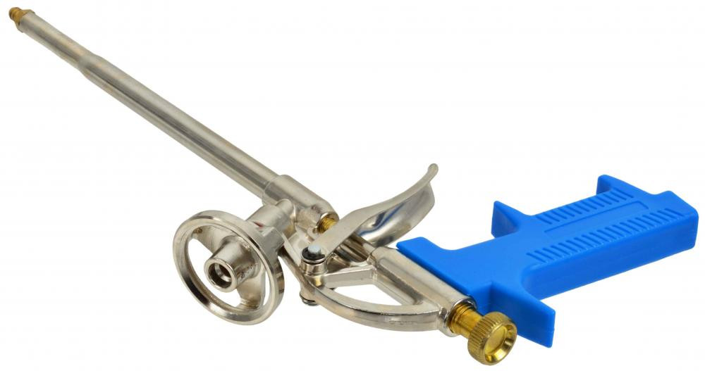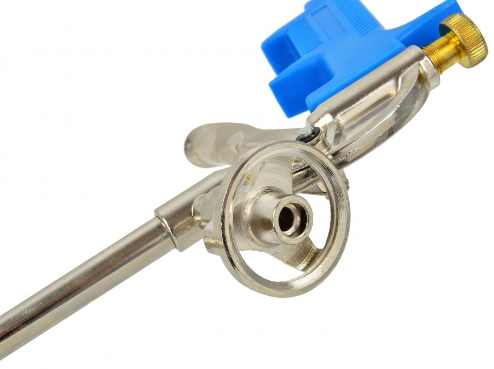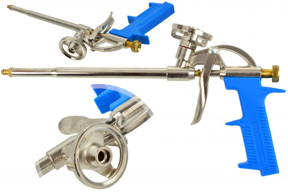 Pištoľ určená na montáž pien. Pištoľ má gombík, ktorý umožňuje presné dávkovanie peny. S nainštalovanou nádobou na penu umožňuje gombík tiež opätovné použitie pištole až 30 dní bez potreby čistenia.