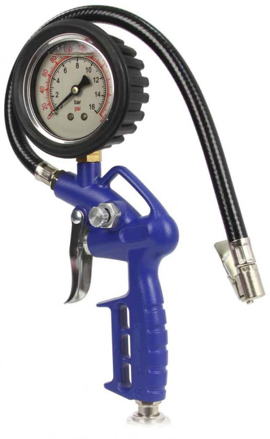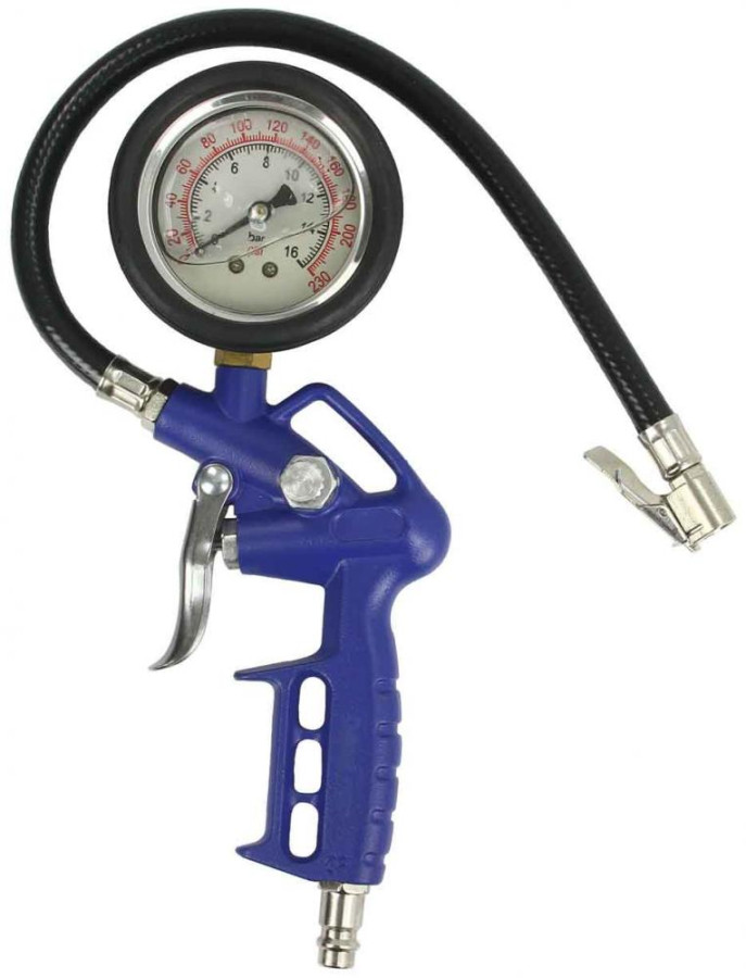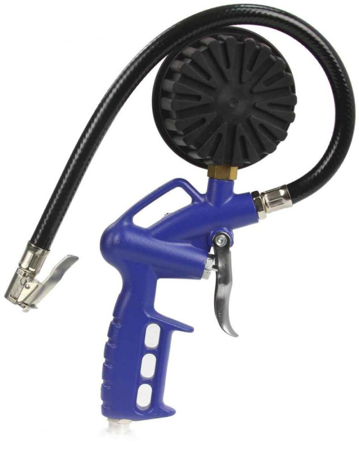 Pištoľ s manometrom na hustenie kolies. Prístroj umožňuje nafúknuť kolesá pre autá, bicykle atď. Vybavené štandardnými ventilmi do auta. Pištoľ je vybavená vstavaným výstupom vzduchu a štandardným prívodom vzduchu (1/4 ").