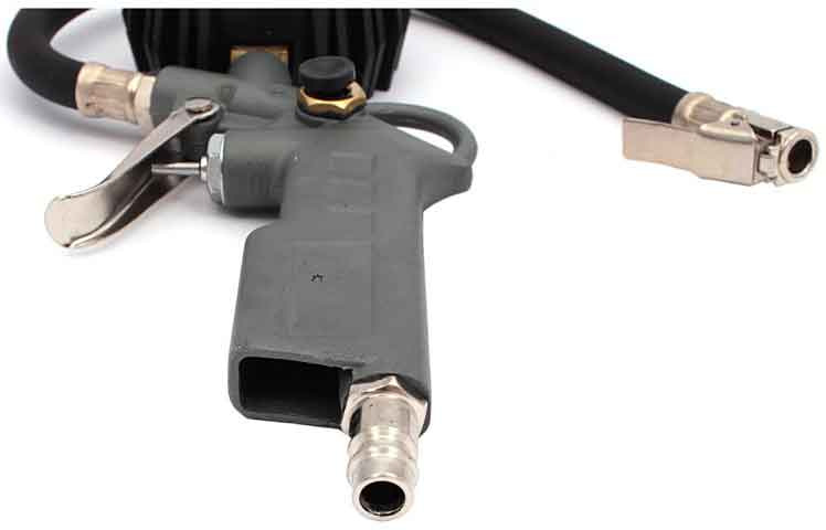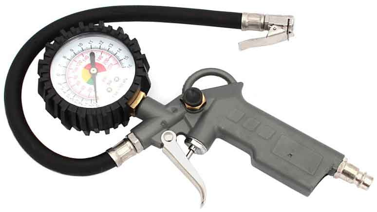 Pištoľ s manometrom na hustenie kolies. Prístroj umožňuje nafúknuť kolesá pre autá, bicykle atď. Vybavené štandardnými ventilmi do auta. Pištoľ je vybavená vstavaným výstupom vzduchu a štandardným prívodom vzduchu (1/4 ").