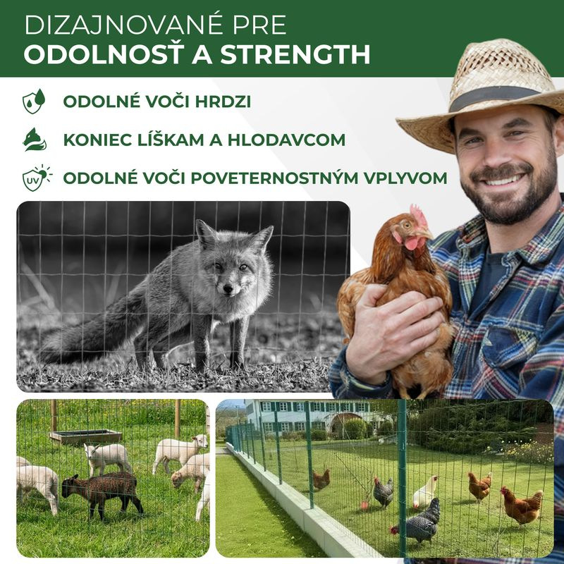 - Materiál: Pozinkovaný drôt s PVC povlakom zaručuje maximálnu odolnosť proti korózii, UV žiareniu a poveternostným vplyvom, čím predlžuje životnosť oplotenia.