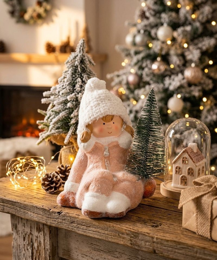 Postavička MagicHome Vianoce, Dievčatko so stromčekom, terakota, 14,5x13x17 cm