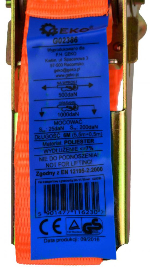 Remeň upínací s račňou 1000 kg, 2 háky, 25 mm x 6 m, GEKO