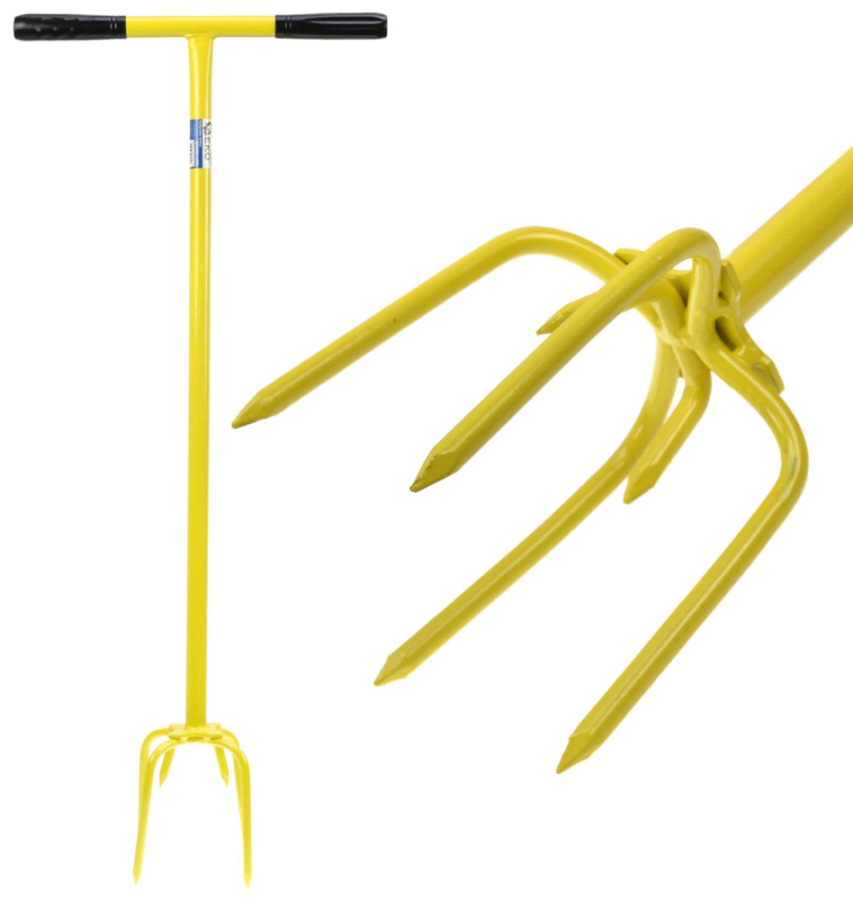 Vybavený 6 špicatými hrotmi, mierne špirálovitá pracovná časť a rukoväť v tvare T uľahčujú zapichnutie nástroja do pôdy.