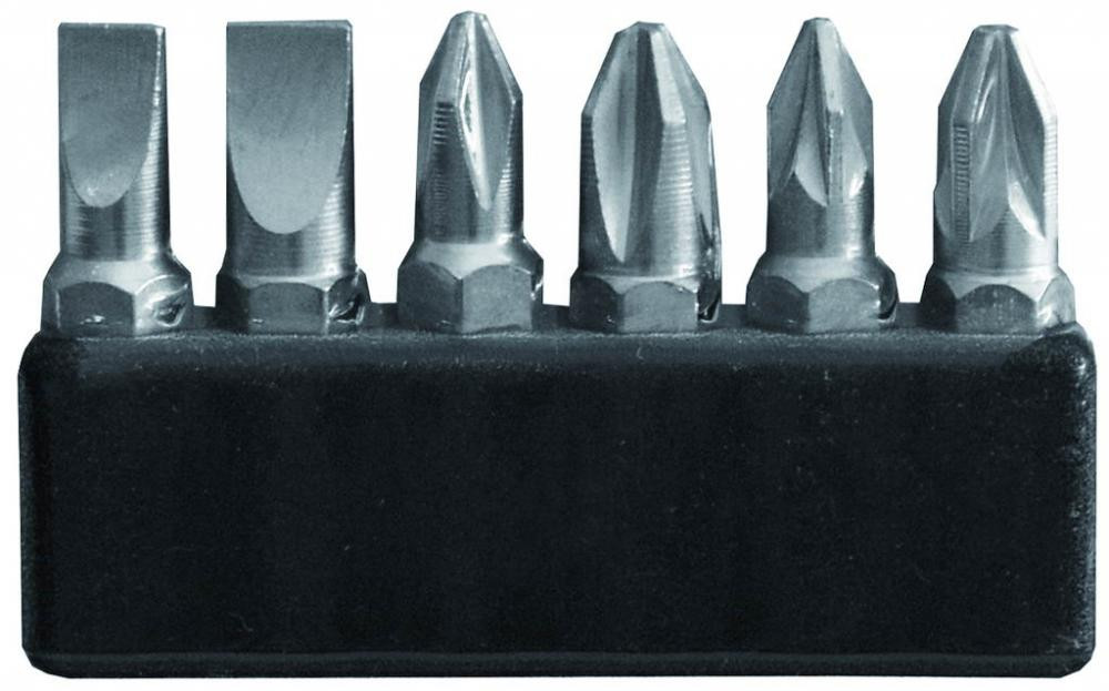 Sada obsahuje 25 mm bity: PL 0,8x 5,0 , PL 1,0 x 6,0 , PH1, PH2, PZ1, PZ2.