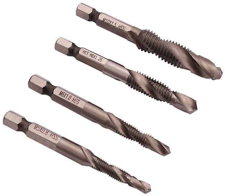 4-dielny HSS vrták so sadou závitníkov 5, 6, 8, 10 mm je ideálny nástroj na vŕtanie a rezanie závitov do valcovanej ocele a neželezných kovov. Vďaka súčasnému vŕtaniu a rezaniu závitov je nástroj mimoriadne efektívny a šetrí čas. Vrtáky majú stopku 1/4 palca, čo umožňuje ich použitie s rôznymi vŕtacími zariadeniami.