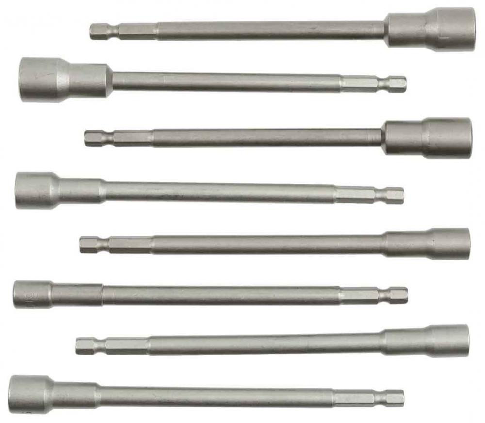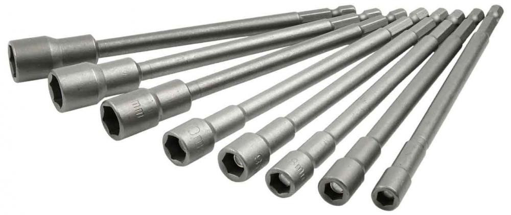 Sada dlhých magnetických držiakov bitov. Sada obsahuje 8 kusov držiakov s dĺžkou 150 mm a veľkosťou 6-13 mm. Každý držiak má magnet, ktorý zaisťuje bezpečné uchytenie skrutky. Vyrobené z odolnej chróm-vanádiovej (CrV) nástrojovej ocele.