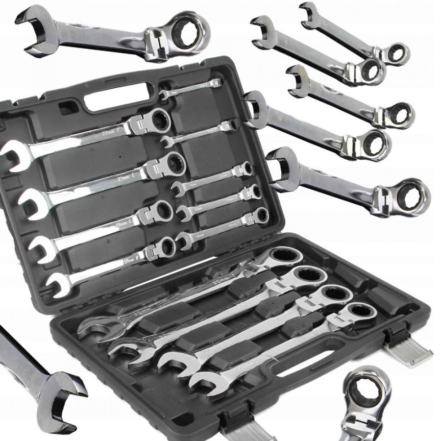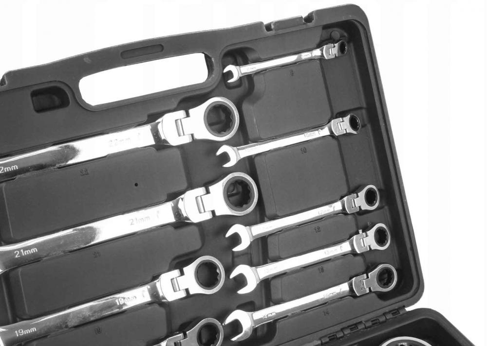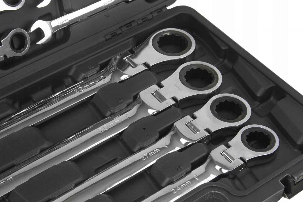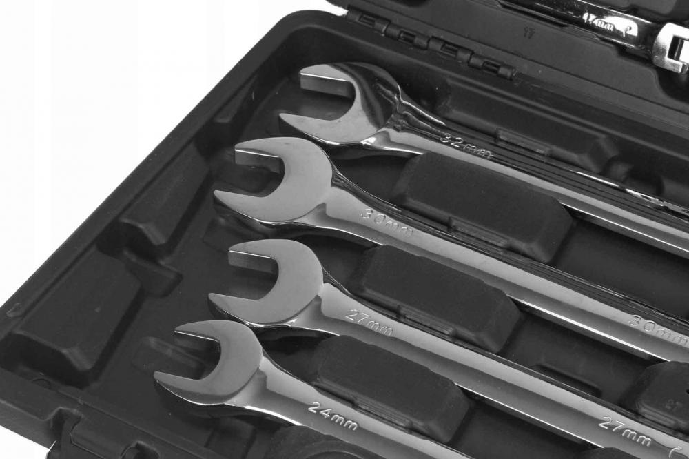 Sada kombinovaných kľúčov s račňou (72 zubov, 8-32 mm) vyrobená z odolnej chróm-vanádiovej ocele (CrV). Použitie vhodné v profesionálnych dielňach pre automobily, ako aj v domácich garážach. Kľúče sú umiestnené v hliníkovom kufríku.