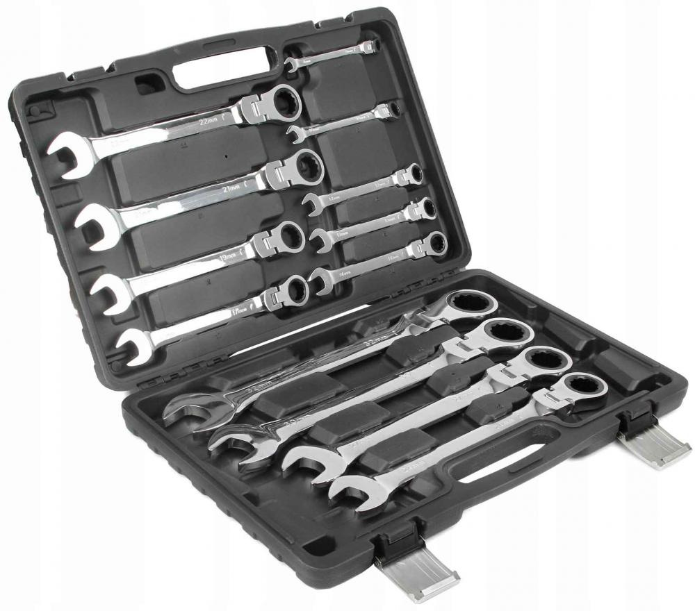 Sada kombinovaných kľúčov s račňou (72 zubov, 8-32 mm) vyrobená z odolnej chróm-vanádiovej ocele (CrV). Použitie vhodné v profesionálnych dielňach pre automobily, ako aj v domácich garážach. Kľúče sú umiestnené v hliníkovom kufríku.