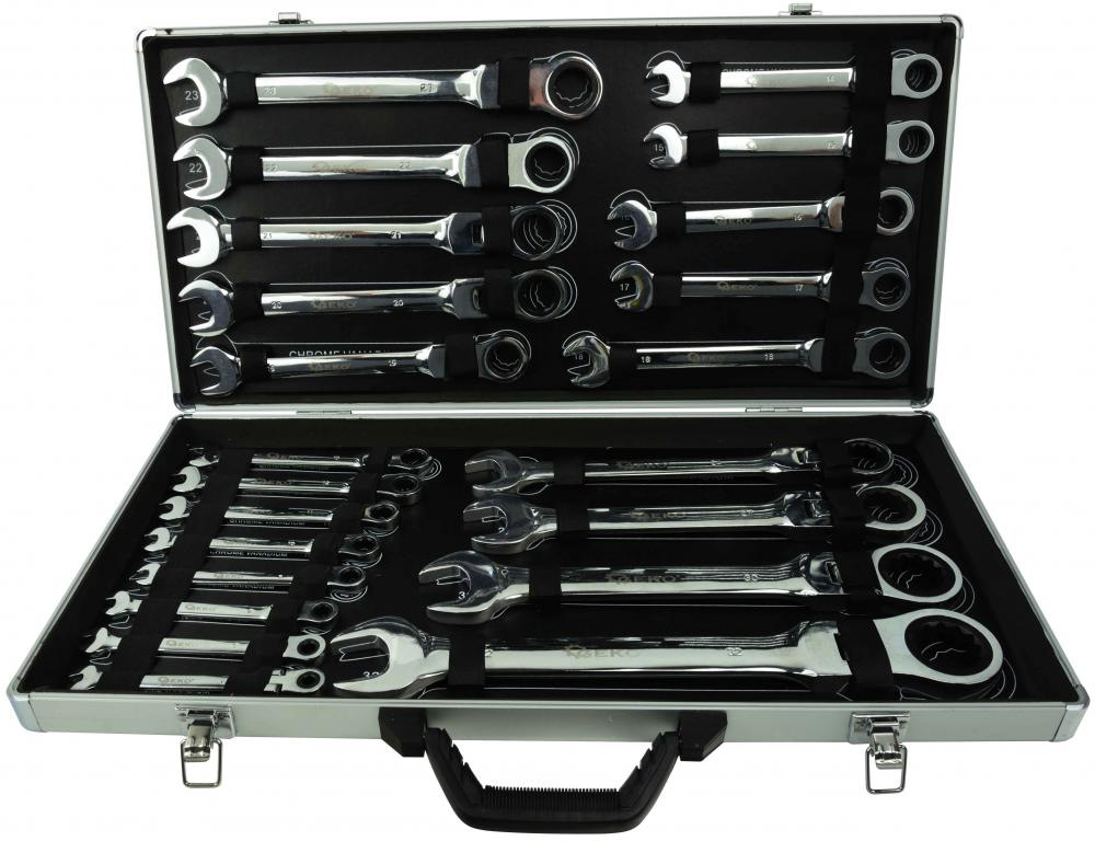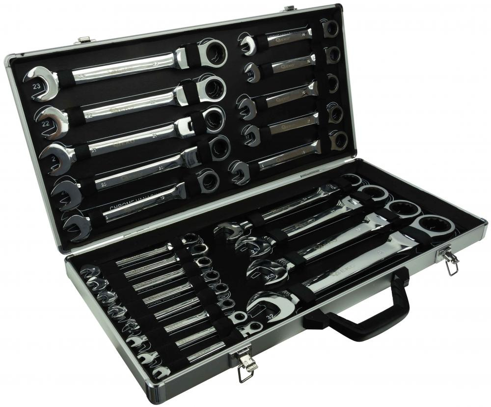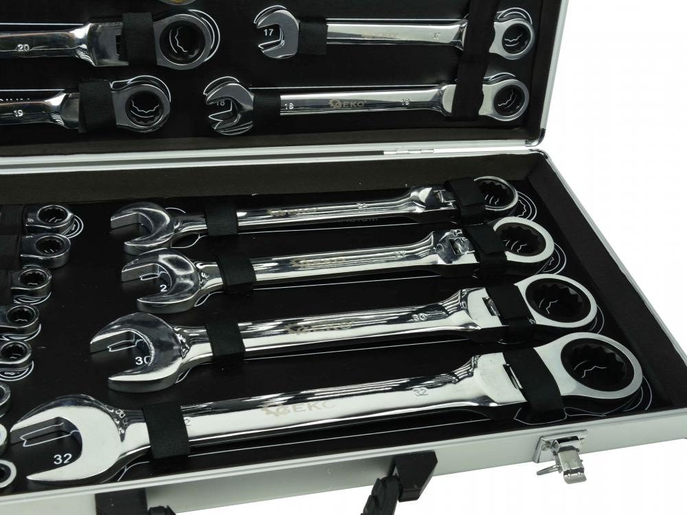 Sada kombinovaných kľúčov s račňou (72 zubov, 6-32 mm) vyrobená z odolnej chróm-vanádiovej ocele (CrV). Použitie vhodné v profesionálnych dielňach pre automobily, ako aj v domácich garážach. Kľúče sú umiestnené v hliníkovom kufríku.