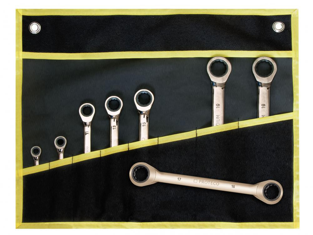 Súprava očkových račňových kľúčov 8 dielov je svojim použitím vhodná pre autopriemysel a dielenstvo, najmä v miestach, kde nie je možné využiť výhody štandardnej račne. Sada očkových račňových kľúčov 6dielov v nylone obsahuje očkové račňové kľúče týchto rozmerov 6 x 8, 8 x 9, 10 x 11, 12 x 13, 14 x 15, 16 x 17, 17 x 19 a 18 x 19 mm. Každý kľúč zo sady očkového račňového kľúča 8 dielov v obale je z chróm-vanádiovej ocele a navyše potiahnutý unikátnym povlakom „GUNMETAL“, ktorý dramaticky zvyšuje ochranu proti korózii a prípadnému opotrebovaniu. Račňu kľúča tvorí 72 kalených zubov, ktoré umožňujú krok záberu už po 5-tich oblúkových stupňoch. Hlava očkového račňového kľúča je tenkostenná a umožňuje tak prácu v ťažko prístupných miestach. Uťahovací moment vyhovuje norme ANSI.