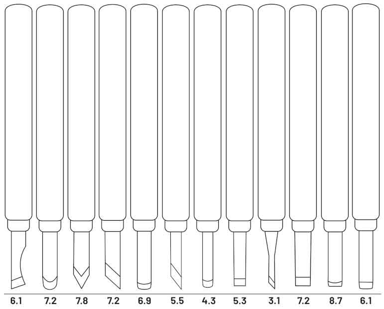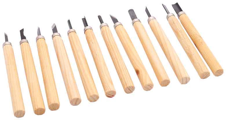 Sada 12 kusov dlát na drevo vybavených oceľovou čepeľou namontovanou na drevenej rukoväti. Perfektný nástroj na vyrezávanie do dreva, hliny, sadry alebo podobných mäkkých materiálov. Majú ergonomické rukoväte z lakovaného dreva, ktoré dobre padnú do ruky. Sú vyrobené z vysoko kvalitnej brúsenej ocele.