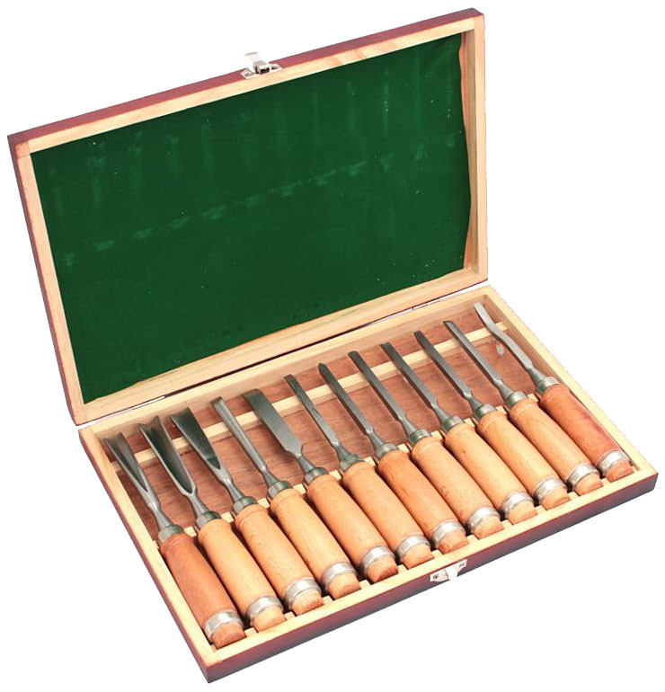 Sada rezbárskych dlát 12 dielna určená na opracovanie dreva a drevu podobných materiálov. Vyznačujú sa rôznymi profilmi čepele, ktoré umožňujú presné tvarovanie a vyrezávanie. Rukoväte vyrobené z dreva uľahčujú pohodlnú a bezpečnú prácu a kovové krúžky na ich koncoch chránia pred poškodením. Čepele dláta sú vyrobené z nástrojovej ocele, čo zabezpečuje ich dlhodobú ostrosť a odolnosť. Súprava je uložená v drevenej krabici, ktorá poskytuje elegantný vzhľad a uľahčuje organizáciu a prepravu náradia.