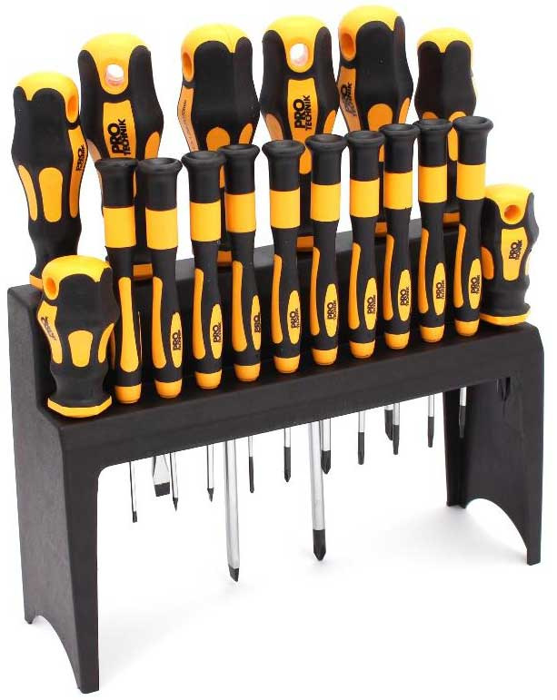 Profesionálna sada skrutkovačov PRO-TECHNIK v praktickom plastovom držiaku, ktorý je možné upevniť na stenu. Ergonomická dvojzložková rukoväť potiahnutá gumou poskytuje pevné uchopenie a poskytuje pohodlie pri práci.