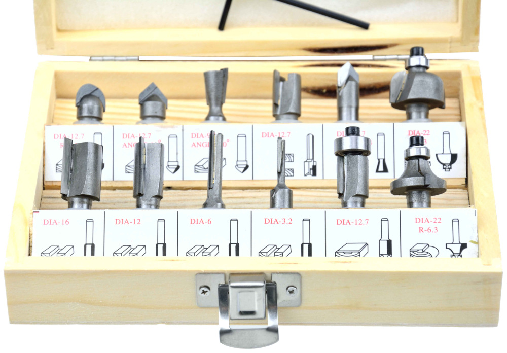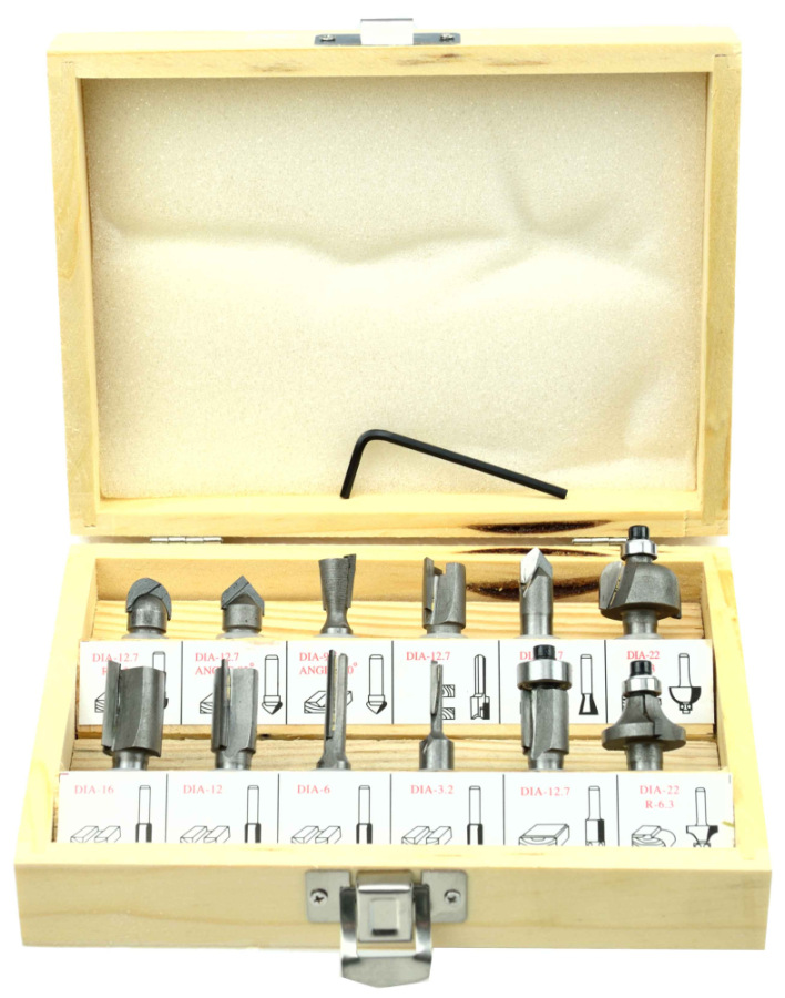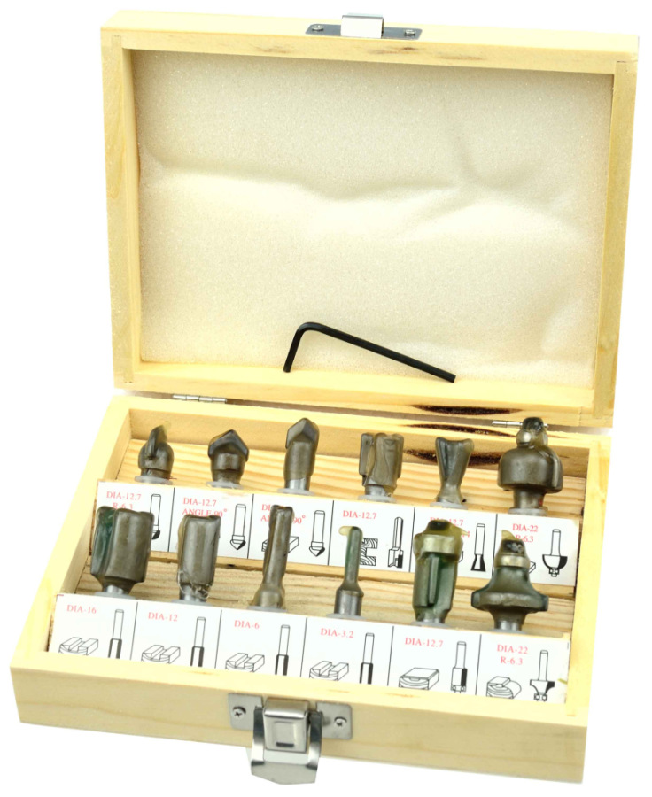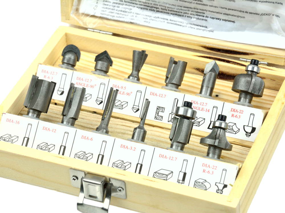 Sada 12 tvarových fréz na drevo umožňujúce presné spracovanie materiálu. Čepele z rýchloreznej ocele HSS umožňujú použitie fréz na spracovanie masívneho dreva, drevotriesky, MDF a iných materiálov na báze dreva. Použité ložiská znižujú valivý odpor, preto sú frézy ideálne na tvarovanie oblých materiálov. Celé to bolo umiestnené v praktickom drevenom kufríku, kde má každý vykrajovač svoje označené miesto.