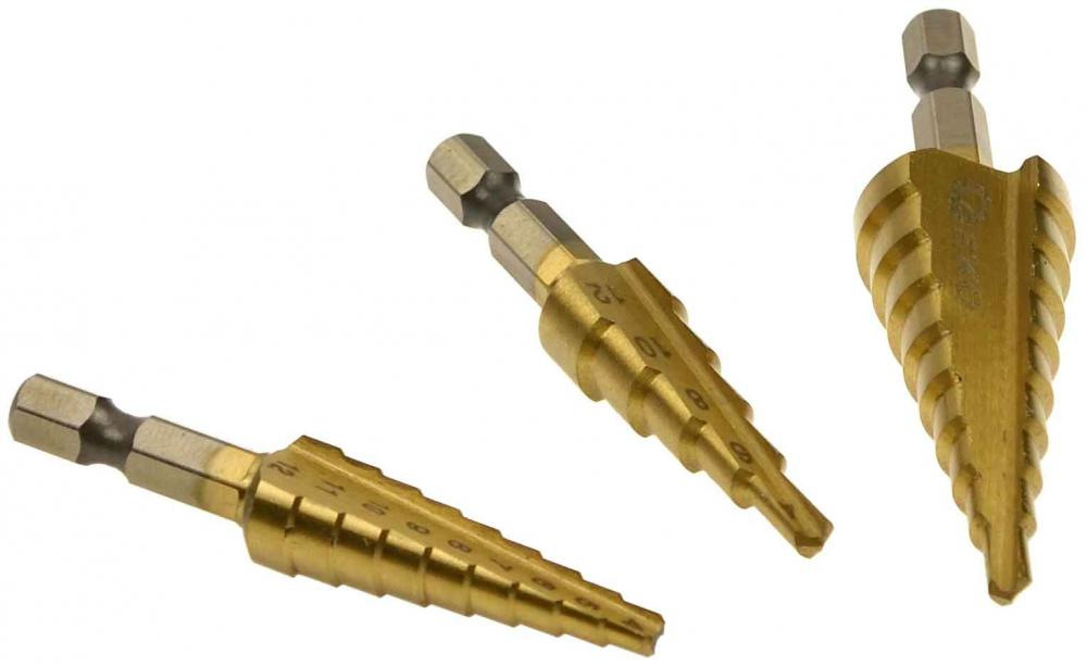 Sada kužeľových vrtákov vo veľkostiach 3-12, 4-12 a 4-20mm. Vrták 1/4 "HEX. Vyrobený z titánovo potiahnutej ocele HSS. Vyvŕtajte dokonale okrúhle otvory do ocele, mosadze, medi, hliníka, dreva a plastu.