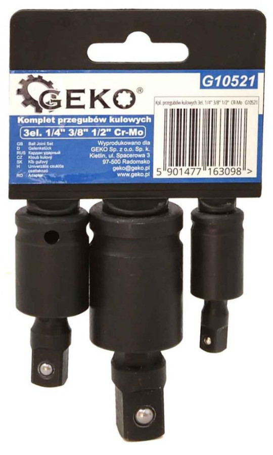 Sada 3 guľových kĺbov vo veľkostiach 1/4, 3/8 a 1/2 ". Guľové kĺby umožňujú dosiahnuť na ťažko dostupné miesta a hlboko usadené skrutky. Zosilnená konštrukcia z chróm-molybdénovej ocele zvyšuje ich odolnosť proti nárazu.