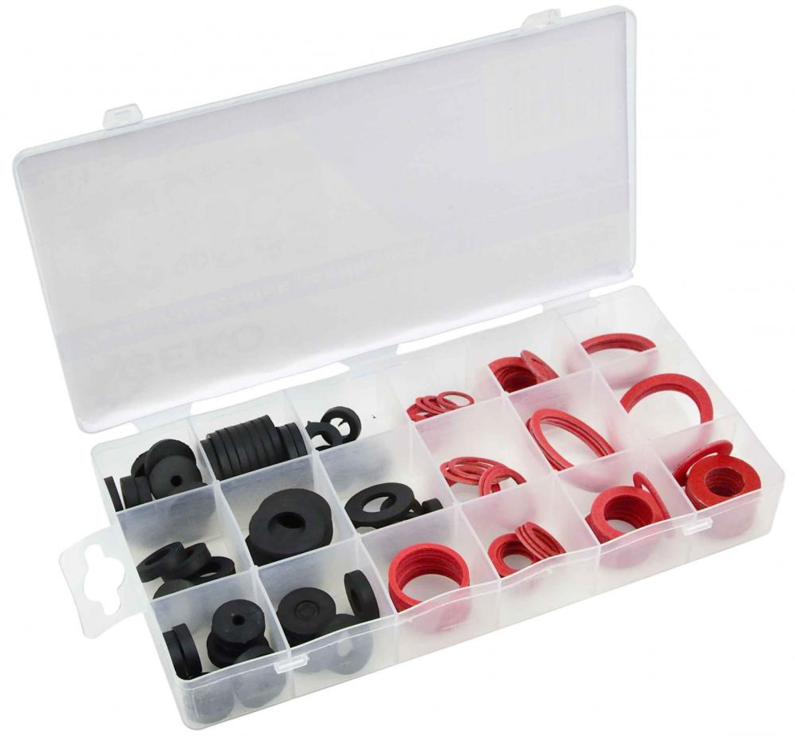 Sada sanitárnych tesnení, gumove tesnenia, vláknové tesnenia a klingeritové tesnenia. Sada obsahuje 141 kusov tesnení v 18 rôznych veľkostiach.