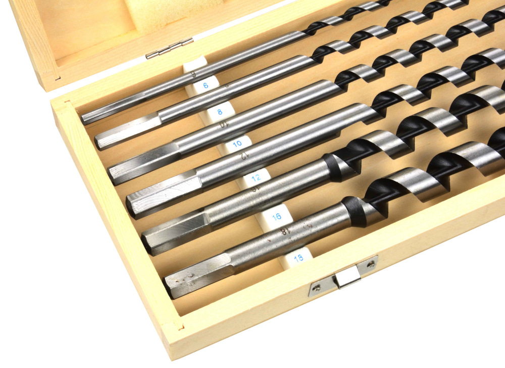 Sada 6 kusov hadovitých vrtákov do dreva v drevenej krabičke.