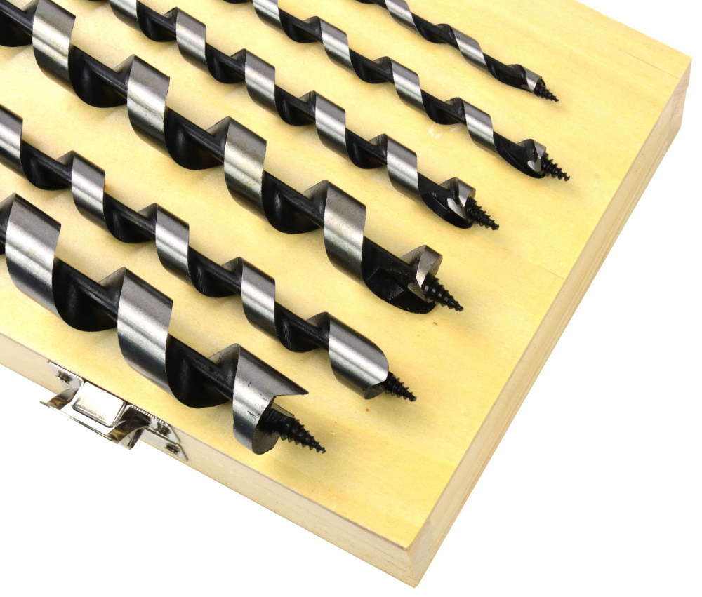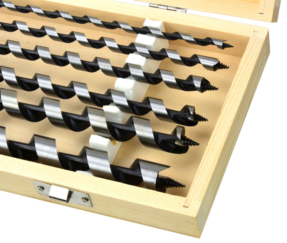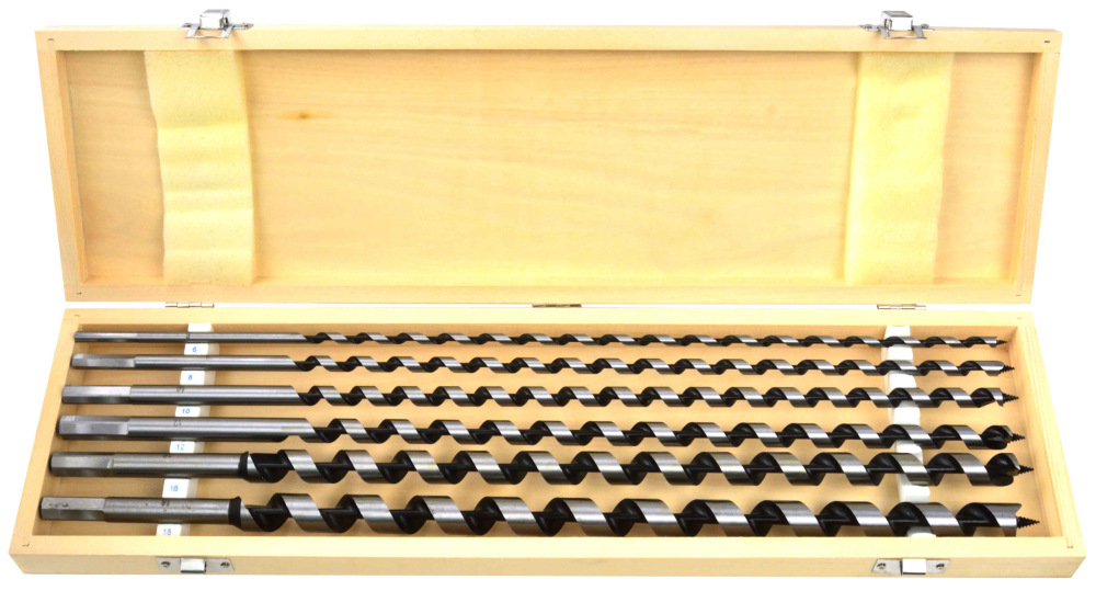 Sada 6 kusov hadovitých vrtákov do dreva v drevenej krabičke.