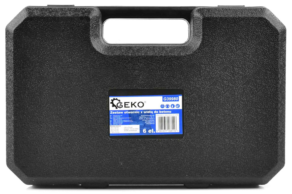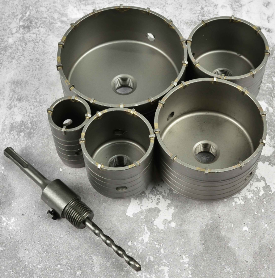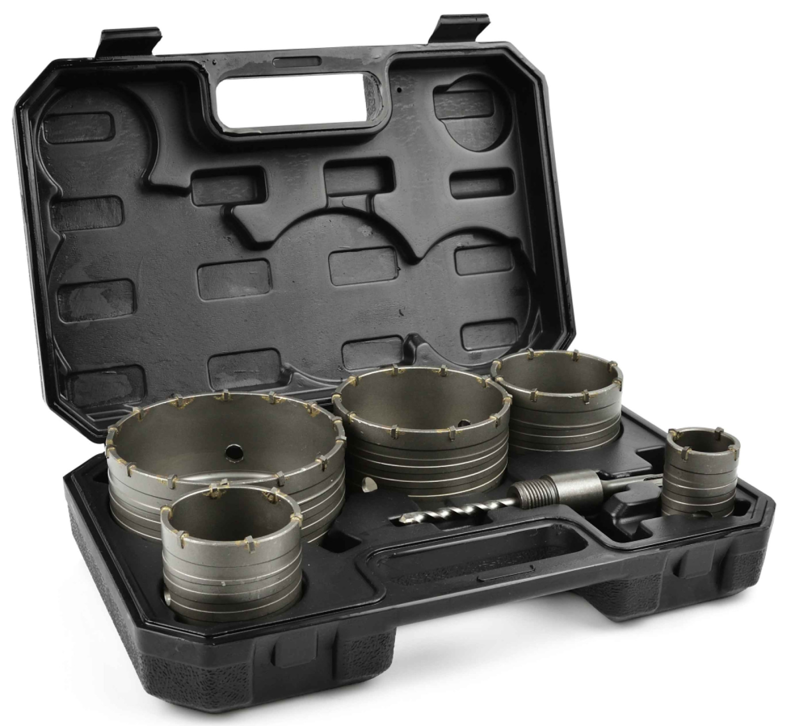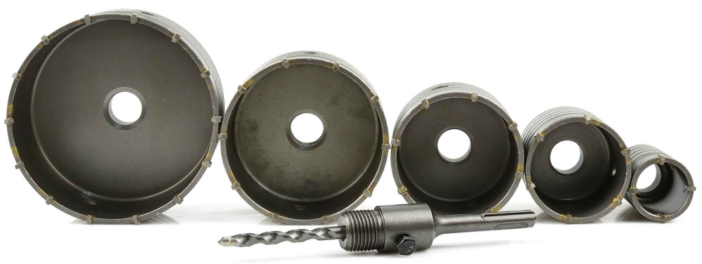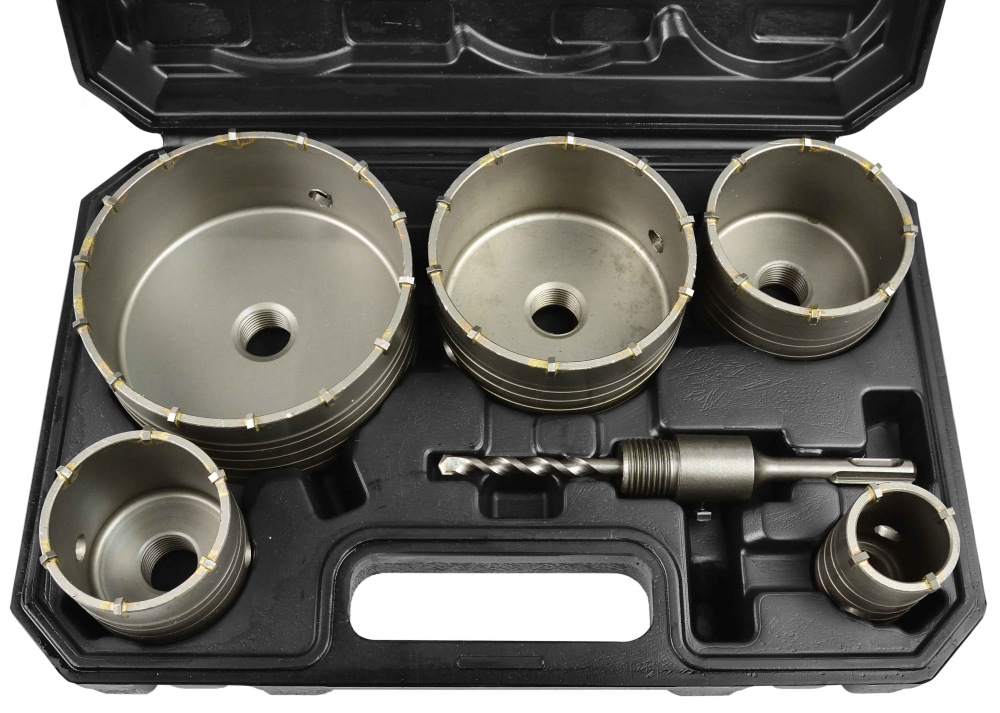 Sada vykružovacích koruniek. Vyrobené z najkvalitnejších materiálov. Ozubený veniec vykružovacích koruniek je vyrobený zo spekaných karbidov. Sada obsahuje adaptér s vodiacim vrtákom, určený na použitie s vŕtačkami s uchytením SDS-Plus.
