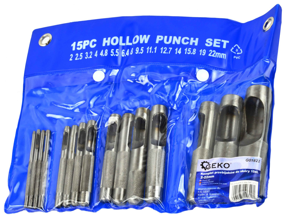 Sada dierovačov do kože 15 ks. 2 - 22 mm. Určené na kožu, gumu, lepenku. Veľkosti razidla: 2 mm ; 2,5 mm; 3,2 mm; 4 mm; 4,8 mm; 5,5 mm; 6,4 mm; 8 mm; 9,5 mm; 11,1 mm; 12,7 mm; 14 mm; 15,8 mm, 19 mm; 22 mm.